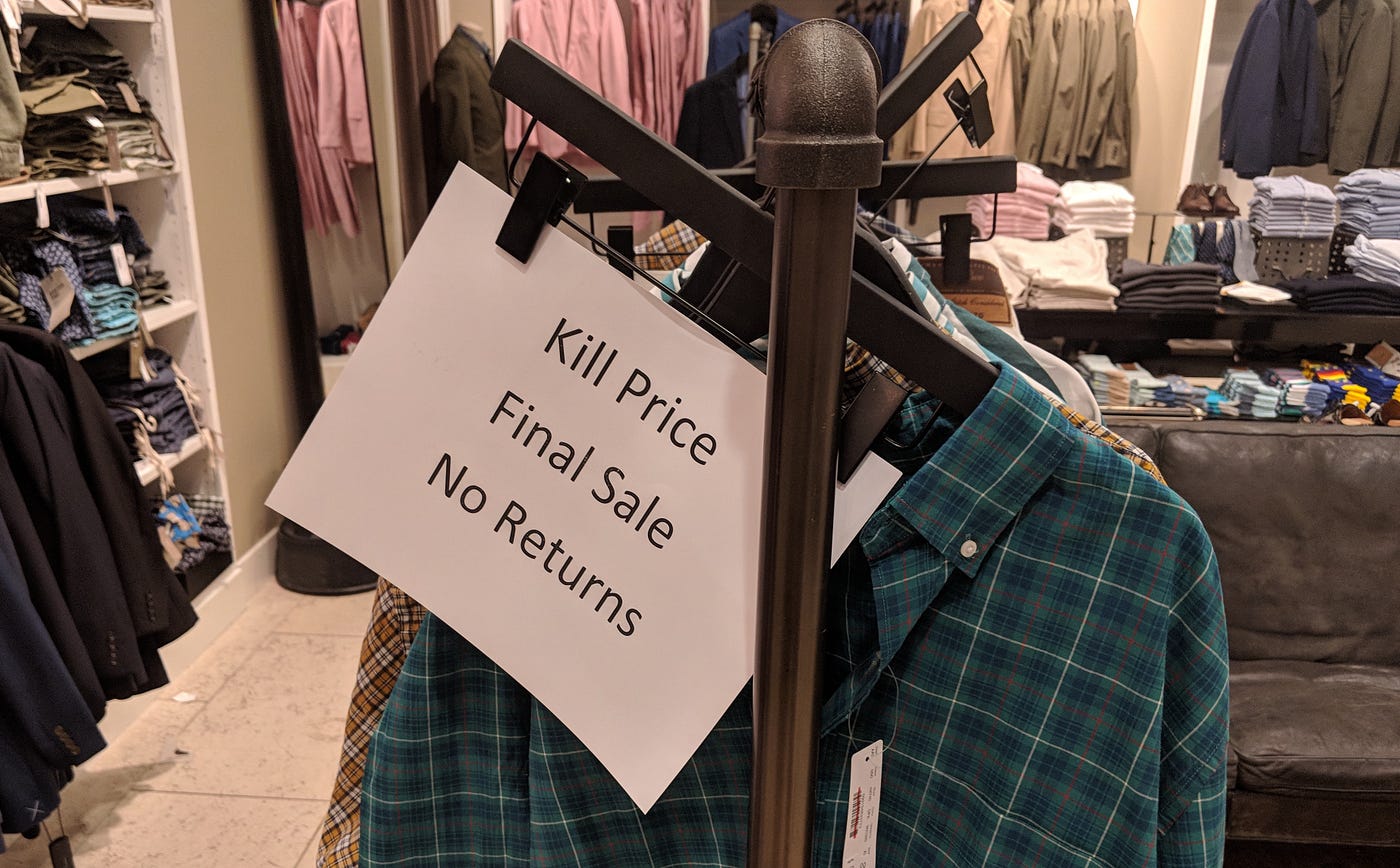 J. Crew getting pretty aggressive with some in-store signage. I wonder where in their brand book you’ll find 8.5×11 Calibri printouts that refer to final sale as “Kill Price”?