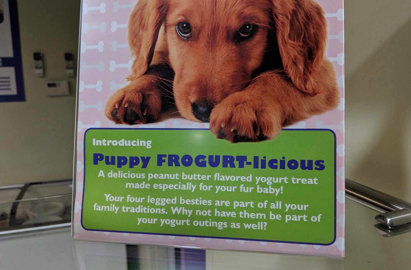 C’mon, are you serious? Puppy Frogurt-licious? Setting aside the fact that it’s frozen yogurt for dogs, maybe come up with a few ideas before settling on something this terrible.