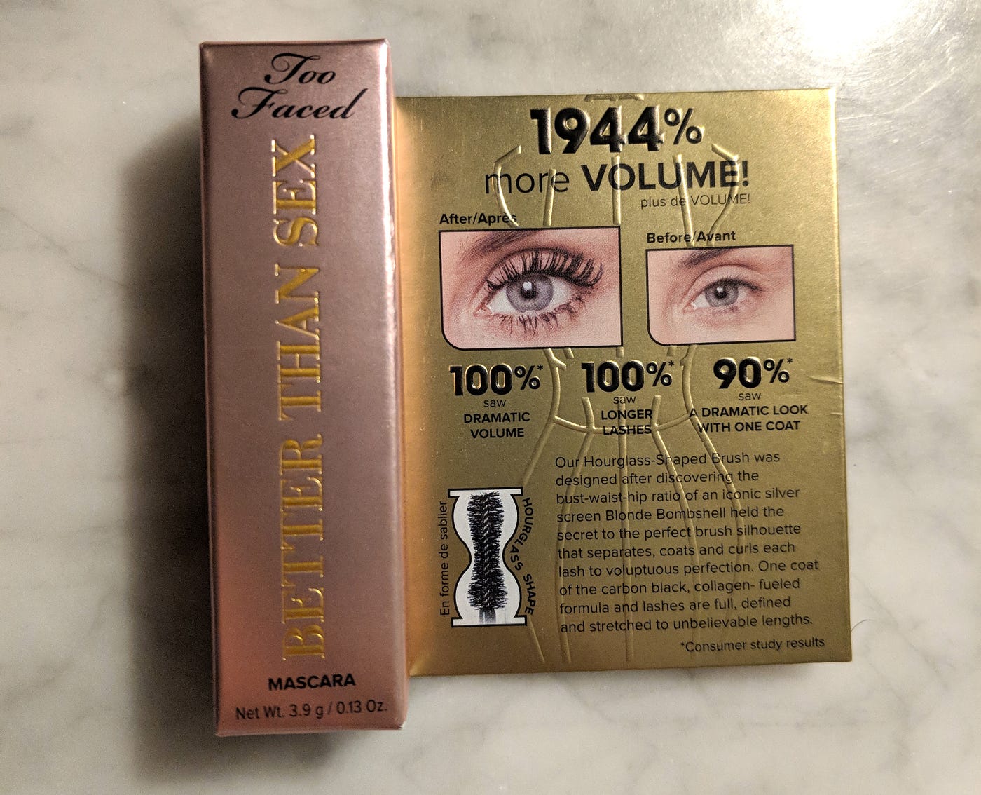 Too Faced Better Than Sex Mascara. Damn. There’s a lot to unpack here. Too Faced is an odd name for a beauty company. It implies that you’re already using too much makeup. I’m not sure how a mascara would go about being better than sex, but then again, this product isn’t aimed at me. I guess the polite thing to do is just feel sorry for the people for whom that’s the case?