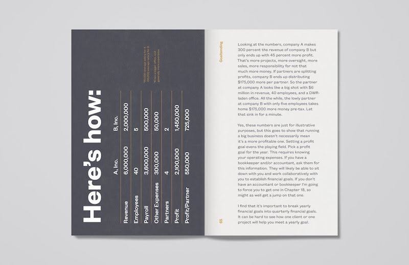 No. This work is too important to offload to someone else. Letting someone else handle the “business side” has been the downfall of countless artists and musicians. Ask Billy Joel. Pretending like you can ignore or outsource the business side of your studio will get you into trouble more often than not. Read books, listen to podcasts, go to conferences. Find a way to make learning about business enjoyable and find a program that you can stick to. On average, I read a business book each quarter and listen to podcasts weekly. I’m not going to lie to you; most business books are pretty boring. Some are poorly written. Some are sexist. Some are poorly written and sexist. Don’t let that stop you from extracting the information that’s useful to you and shaking your head at the rest. When these books get interesting is when you find things you can apply to your studio. For example, Managing the Professional Service Firm by David H. Maister (Simon & Schuster, 1993) is a dense, slow read. But its pages are filled with useful and immediately applicable information. It was written for law firms and big consulting firms but creative studios are absolutely professional service firms and there’s a lot we can learn from our suited counterparts.